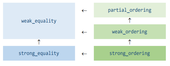 Avec le type de retour. Pour chacun de ces cas, il existe un type dédié : std::strong_ordering pour l’ordre fort, std::partial_ordering pour l’ordre faible et std::weak_ordering pour l’ordre faible. Et lorsqu’on recherche l’égalité, ces types peuvent être convertis en std::weak_equality ou std::strong_equality, ces conversions se faisant comme suit :